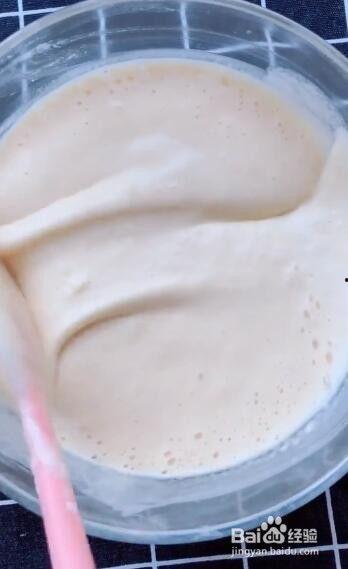 将牛奶和植物油加入面糊中,继续翻拌均匀。